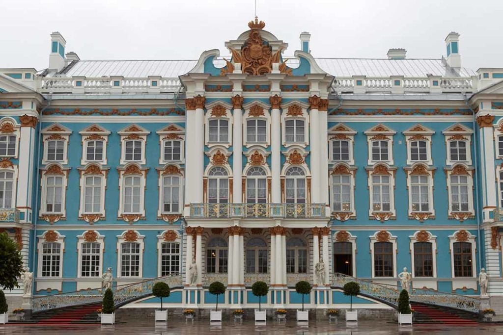 凱瑟琳宮(Catherine Palace)是一座令人印象深刻的藍色,奶油和金色的歷史悠久的建築,彼得大帝彼得(Peter the Great)的妻子塞瑟琳(Catherine)的妻子被設計為凡爾賽宮的對手。